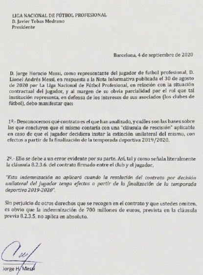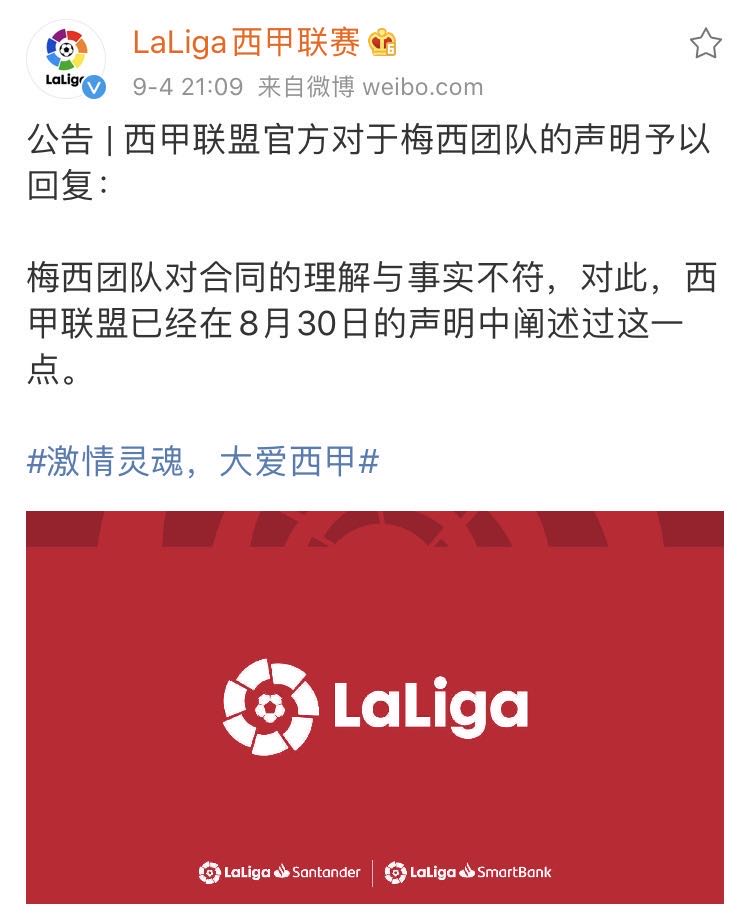 而在梅西发声之前,事件的关键点被摆上台面。先是梅西团队发表声明,根据合同相关条款,梅西可在2019~2020赛季后选择与巴萨解约,成为自由球员,在该前提下,梅西的7亿欧元违约金条款将失效。就此,西甲方面立刻发表官方声明进行了回应,表示梅西团队对合同的理解与事实不符,对此,西甲联盟已经在8月30日的声明中阐述过这一点。事实上,西甲的立场也很容易被理解,没有了梅西的话,西甲的价值与受关注度必然会下降。