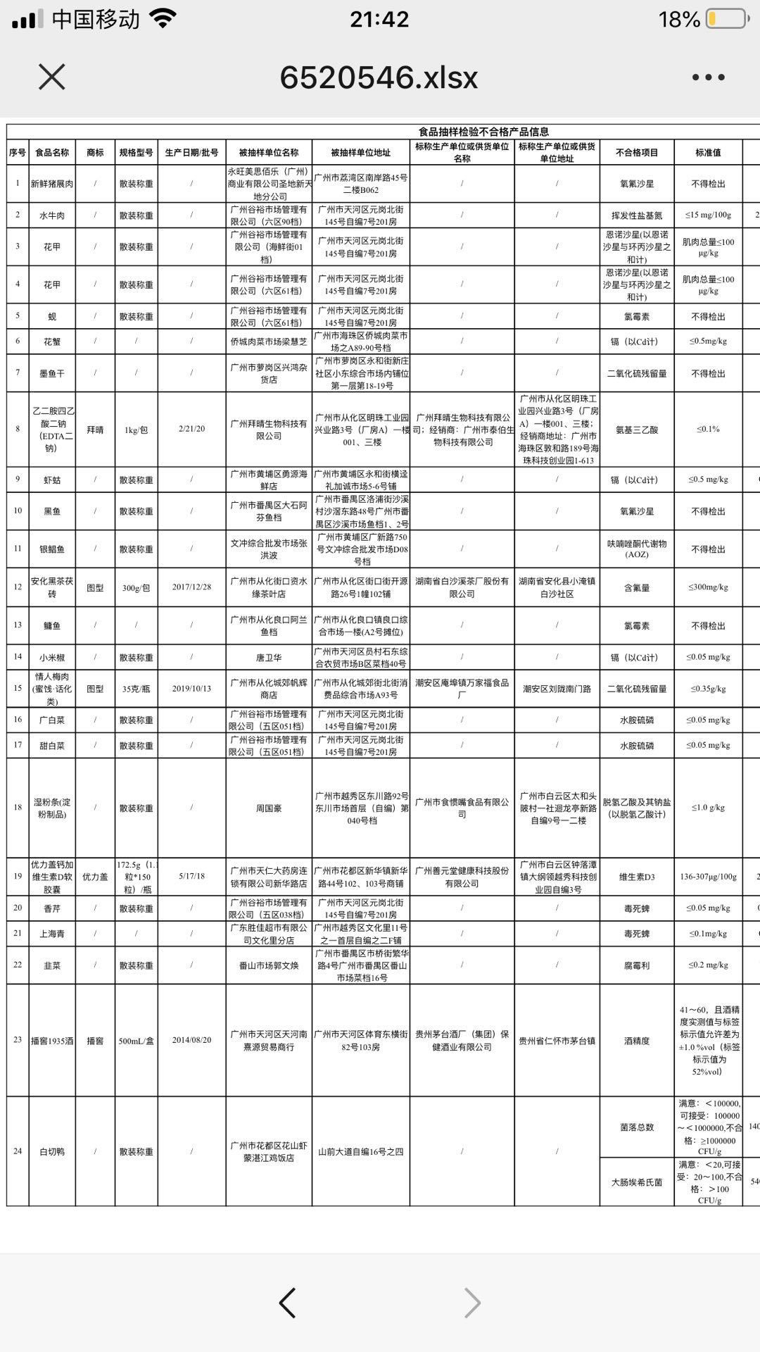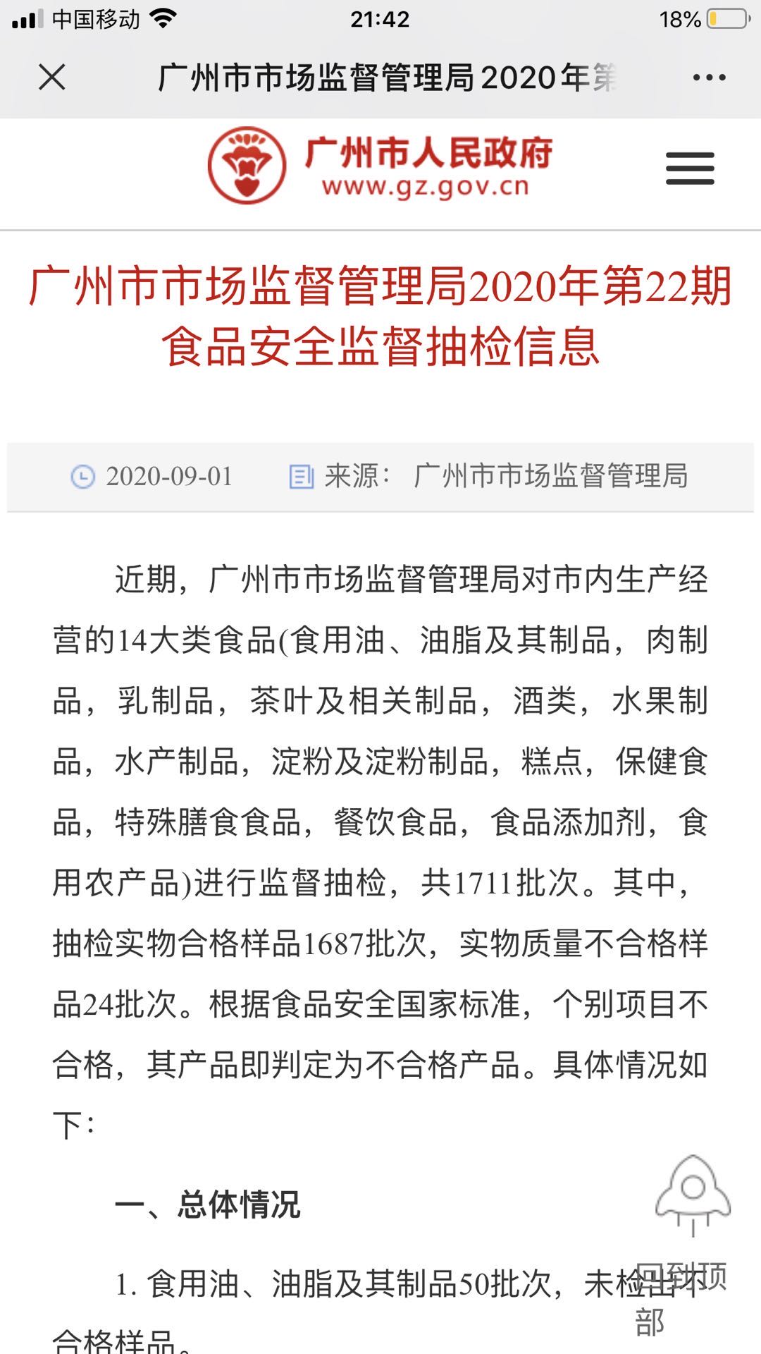 全媒体记者从广州市人民政府网站9月1日发布的《广州市市场监督管理局2020年第22期食品安全监督抽检信息》了解到,近期,广州市市场监督管理局对市内生产经营的14大类食品进行监督抽检,共1711批次。其中,抽检实物合格样品1687批次,实物质量不合格样品24批次。根据食品安全国家标准,个别项目不合格,其产品即判定为不合格产品。