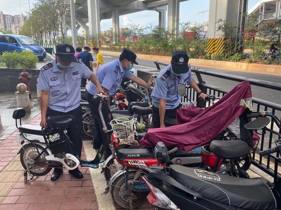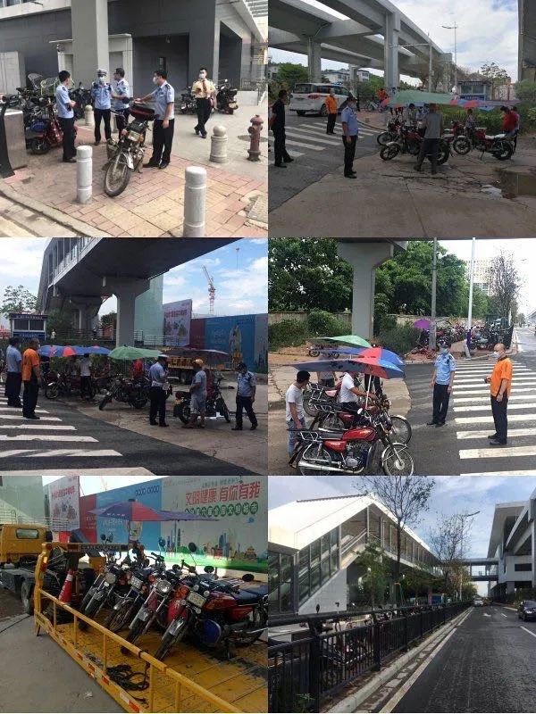▲民警在地铁口查处车辆违规停放、摩托车违规载客等行为。