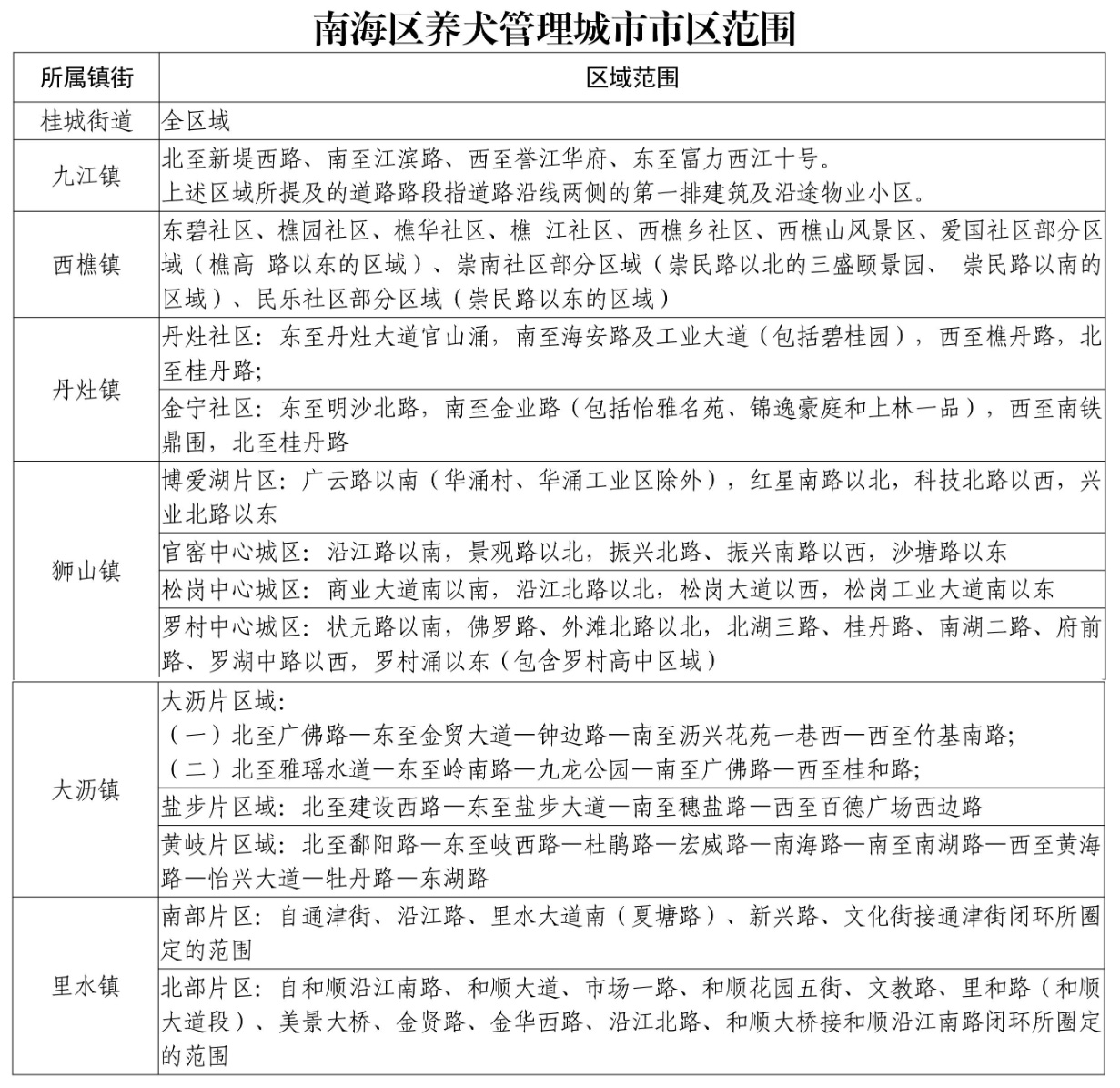 记者今日从佛山市南海区城市管理和综合执法局获悉,南海区养犬管理城市市区范围正式划定,桂城街道全区域和其他6镇部分区域(具体范围见下表)被列为养犬管理城市市区范围,禁止饲养烈性犬。