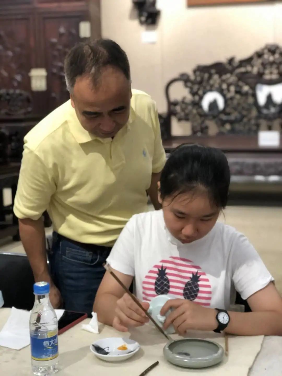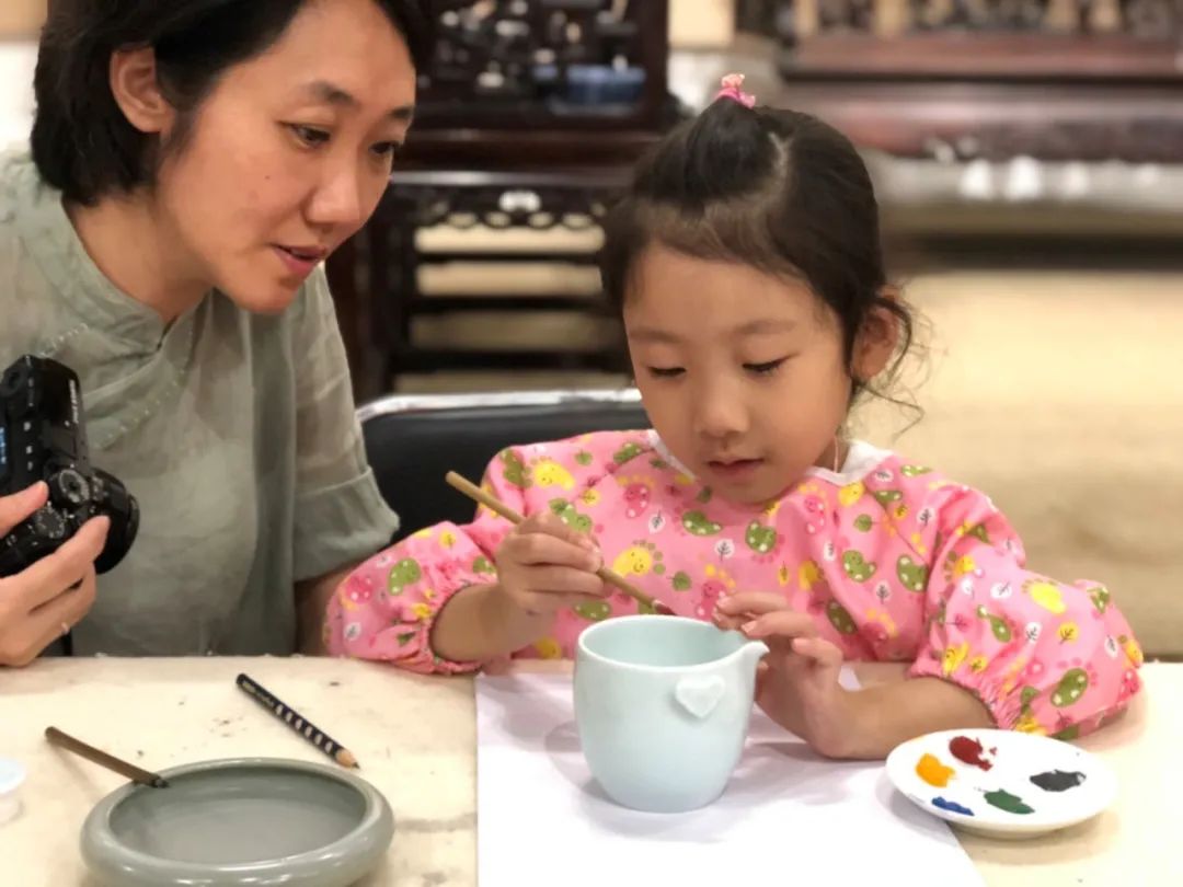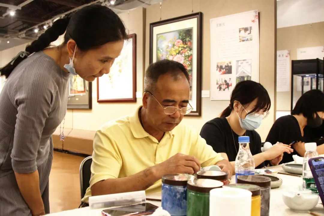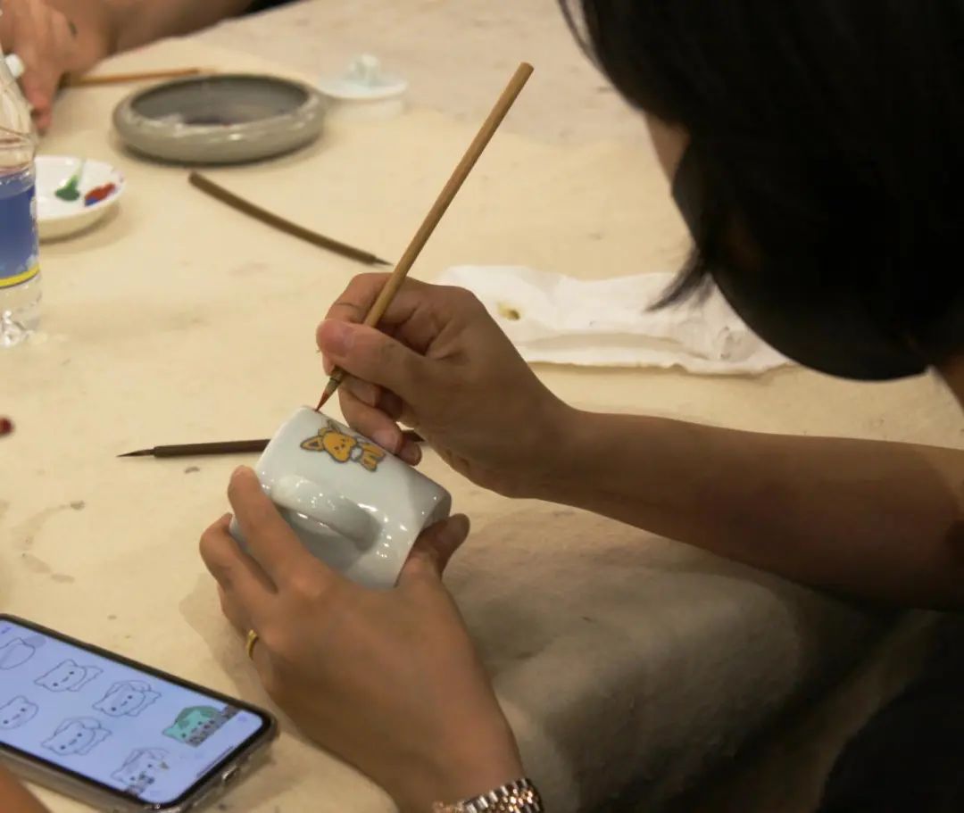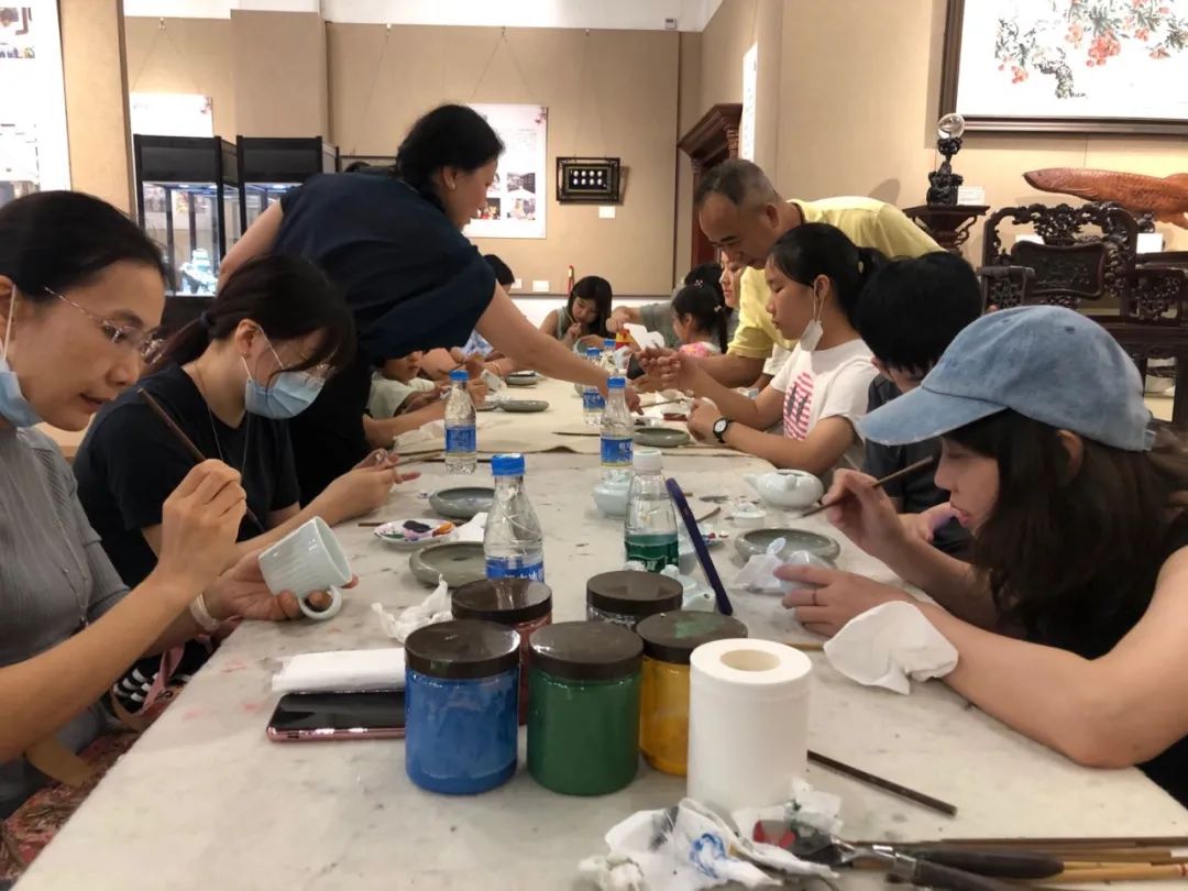 青少年们听完后恍然大悟,便选取自己喜欢的瓷器,开始亲身体验广彩,从图案的选取,图案的描边,再到图案颜色的填充,经过谭广辉大师手把手的指导以及自身的不懈努力,同学们最终都创作出了自己的第一个广彩作品,大家脸上都露出了满意的笑容。