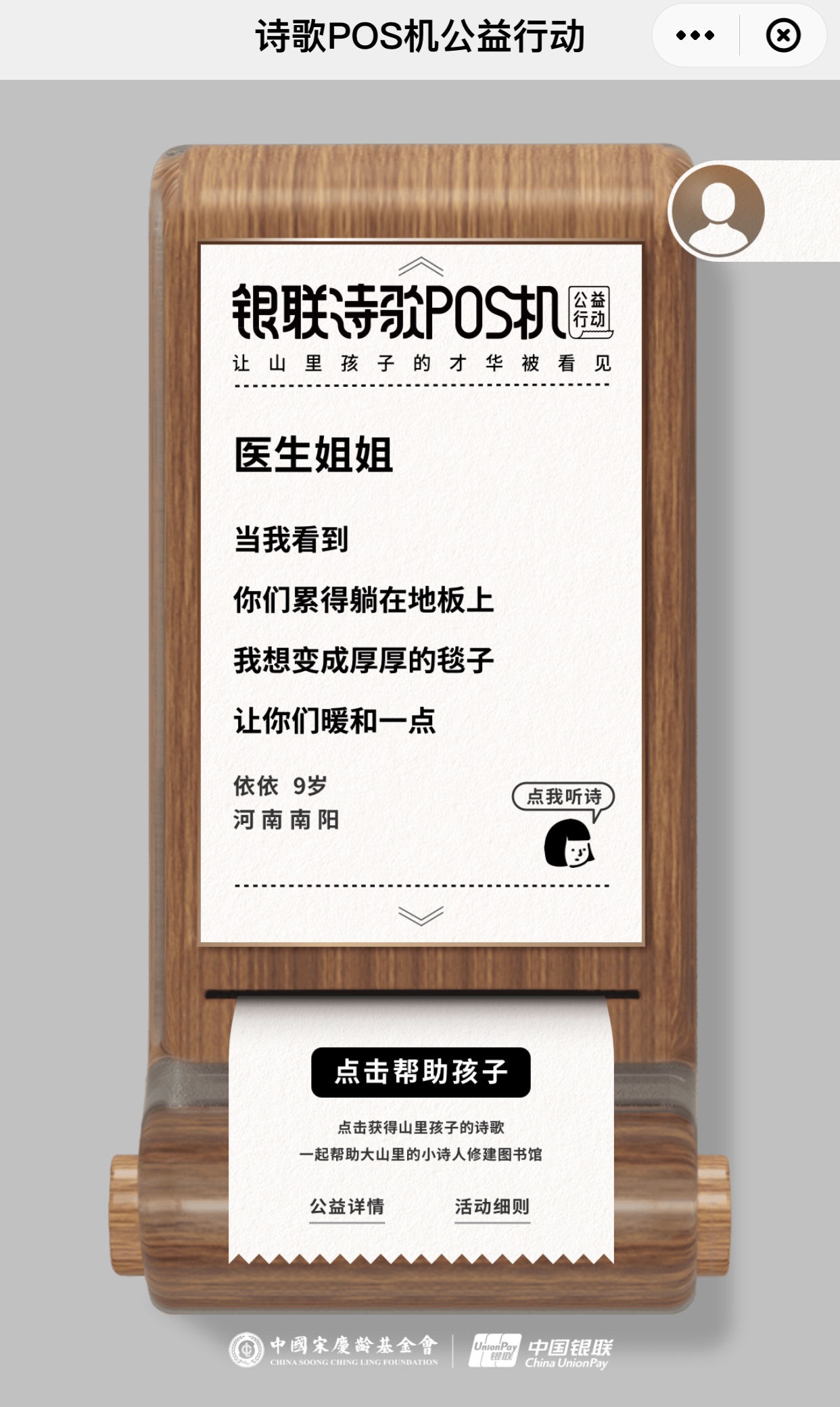 中国银联诗歌POS机公益行动从2019年7月正式启动,当年所募善款已陆续投入到安徽怀远、河南南阳、四川绵阳、新疆喀什、云南南华地区,帮助3140名家庭困难儿童接受艺术教育。2020年,云闪付APP用户数突破3亿,银联再度启动“银联诗歌POS机”公益行动,积极践行社会责任,助力高质量打赢脱贫攻坚战及精神扶贫,促进全社会对欠发达地区的少年儿童的关注,帮助他们接受更优质的教育。