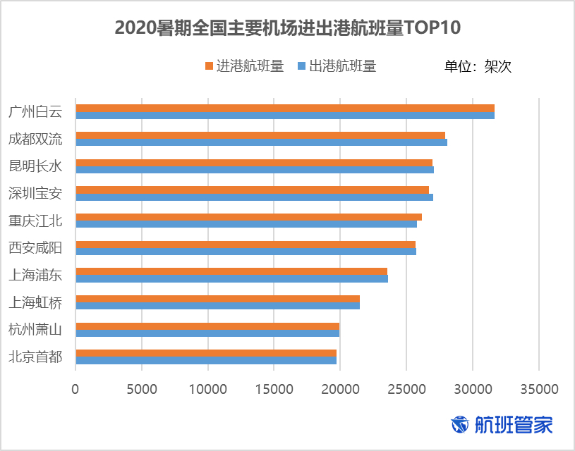 来自航班管家的数据显示,广州白云机场、成都双流机场、昆明长水机场、深圳宝安机场、重庆江北机场、西安咸阳机场、上海浦东机场、上海虹桥机场、杭州萧山机场、北京首都机场的进出港航班量在全国主要机场中位居前十位。