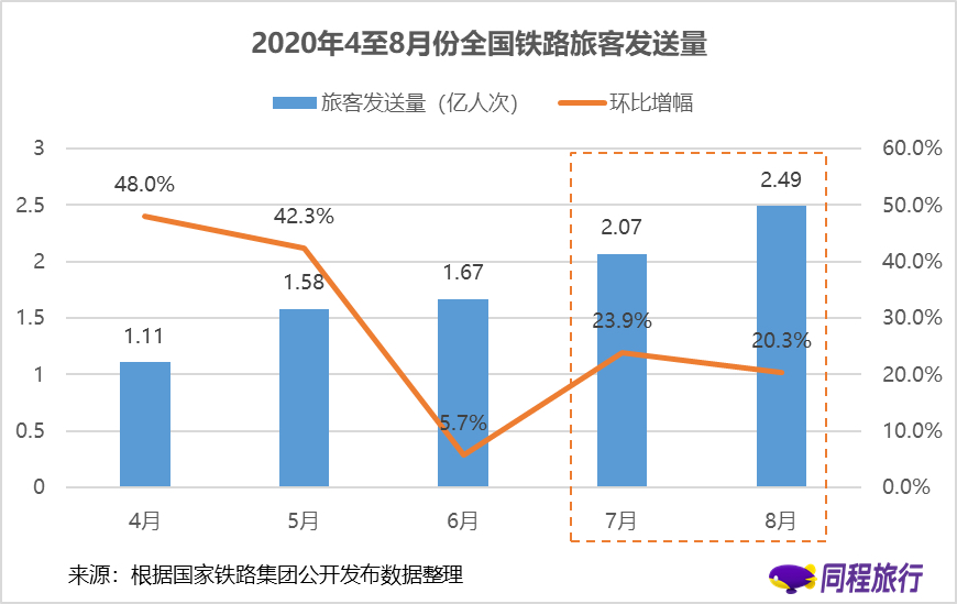 与去年同期客流量的对比来看,8月份的复苏力度明显大于7月份,其中,8月29日全国铁路发送旅客967.6万人次,创2020年春节后单日客流新高。
