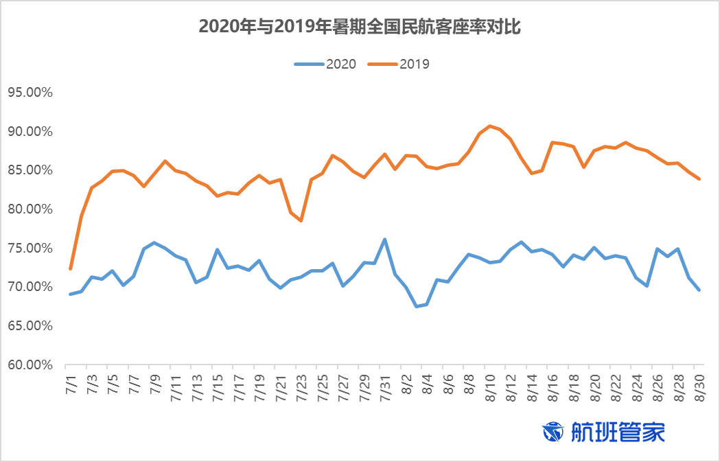 暑期民航客运方面也出现了强劲的复苏趋势。《报告》来自航班管家的数据显示,8月份全国民航航班执行量约为35.7万架次,较7月份增长了13.5%,月平均客座率提升了0.51个百分点。整个暑期(7月和8月)的月平均客座率约为72.49%,达到2019年同期的八成以上。