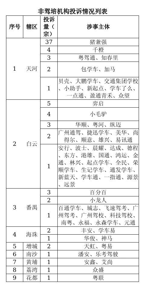 此外,2020年7月,全市驾培行业共发生投诉586宗。其中,涉及教学质量问题225宗,学时安排问题200宗,服务态度问题129宗,其他问题32宗。另,悦悦、码云、永骏吉盛、交运4家驾培机构的投诉量和百辆车投诉量均排名全市前10。2020年7月份,“12345”政府服务热线平台受理涉及非驾培机构投诉144宗。此外还有部分企业为“零投诉”。