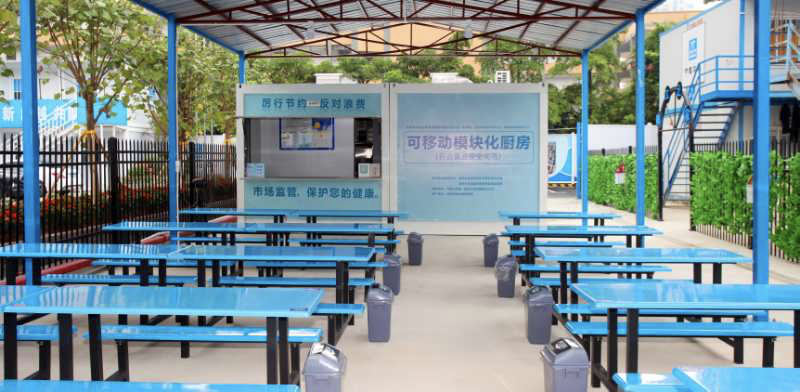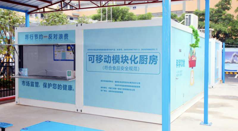 9月9日上午,福田区皇岗中学拆建教学综合楼工程施工现场,一个小型集装箱内飘出了饭菜的香味。这就是深圳市市场监管局和深圳食品物质集团联合推出的全国首个可移动模块化厨房。它可满足该工地200名建设者的供餐需求。市委常委黄敏为厨房经营方颁发了厨房食品经营许可证。