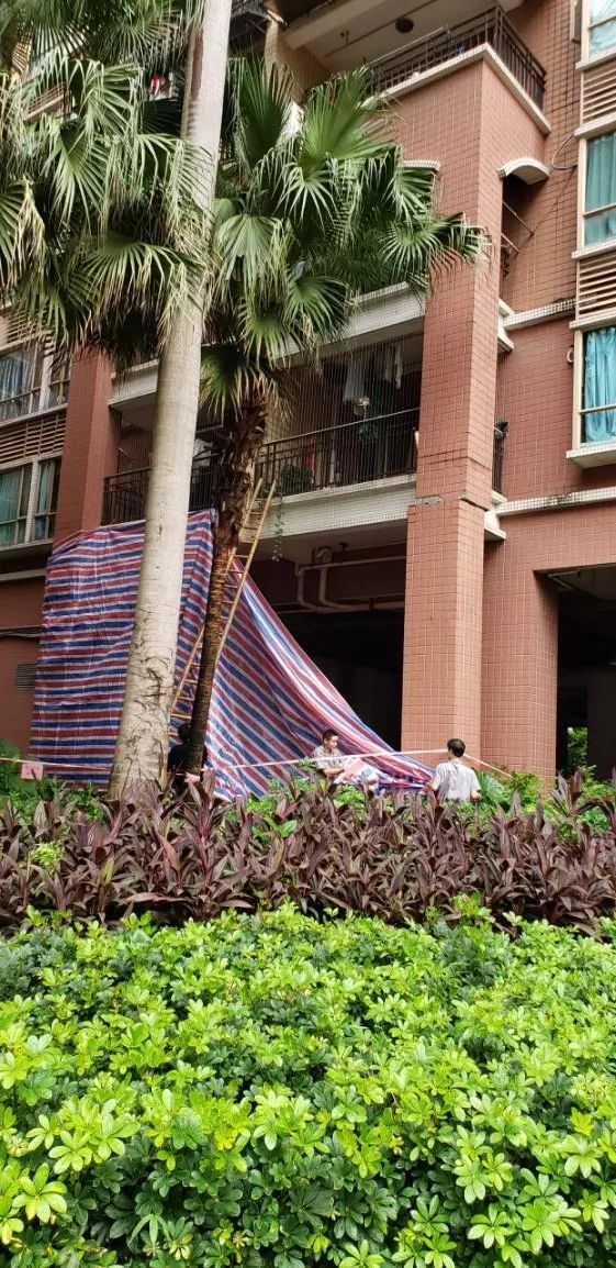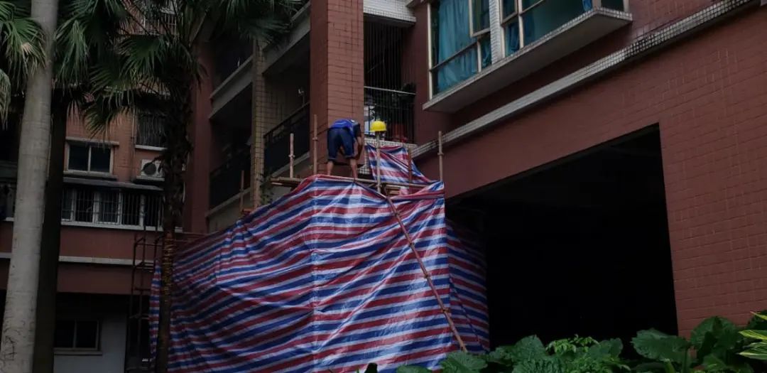 施工单位已进入美林海岸花园,开始对断裂柱子进行修复。
