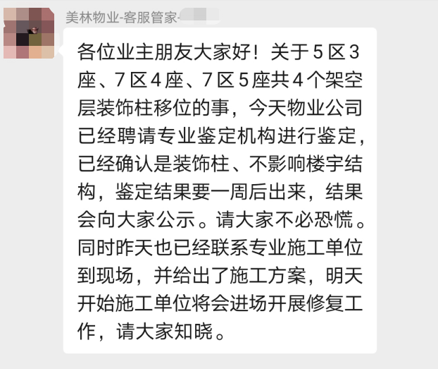由于业主反映强烈,9月8日,该小区物业公司已经聘请专业鉴定机构对柱子进行鉴定,已初步确认是装饰柱,不影响楼宇结构,具体鉴定结果要一周后公布。同时,9日上午,物业公司已邀请施工单位进场对断裂柱子进行修复。