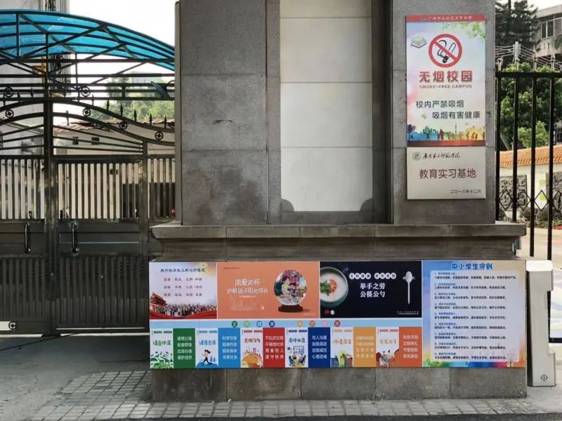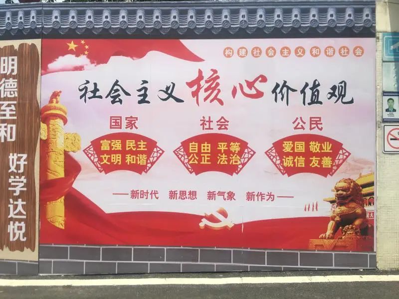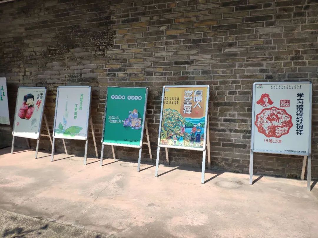 ▲政府周边、古驿道小镇、学校等地张贴和摆放的公益广告。
