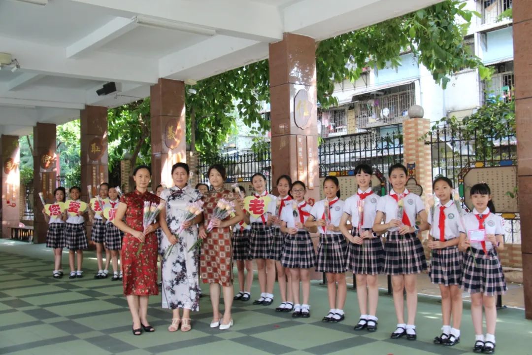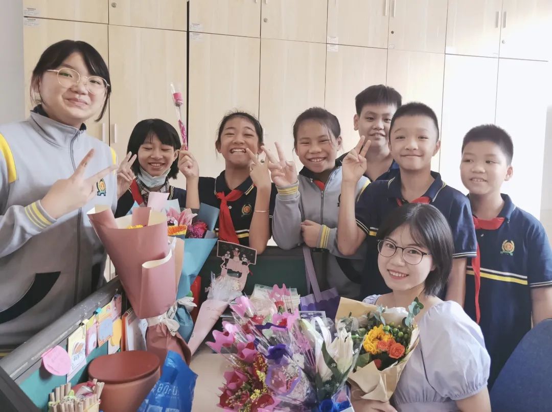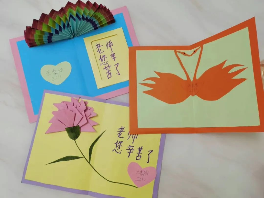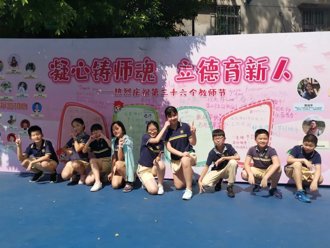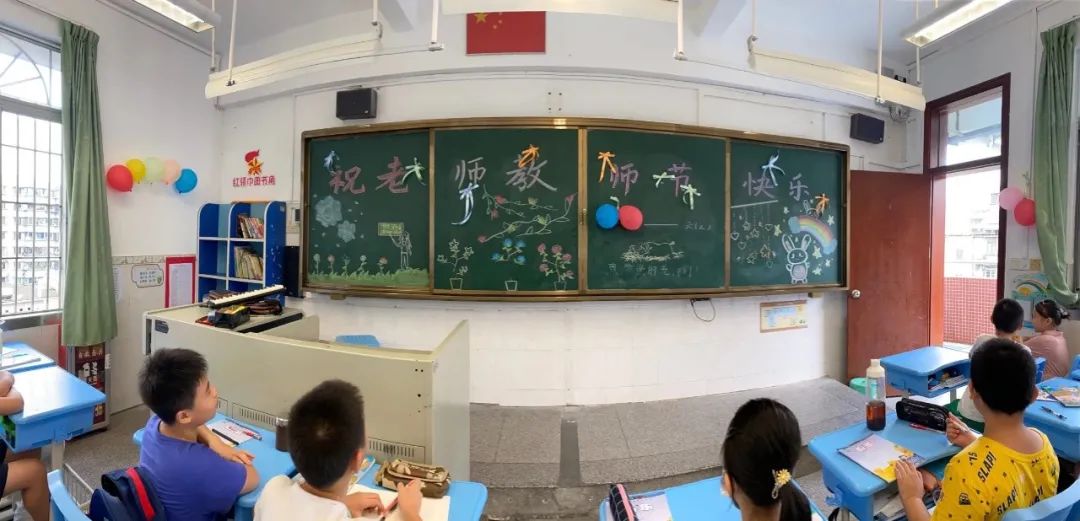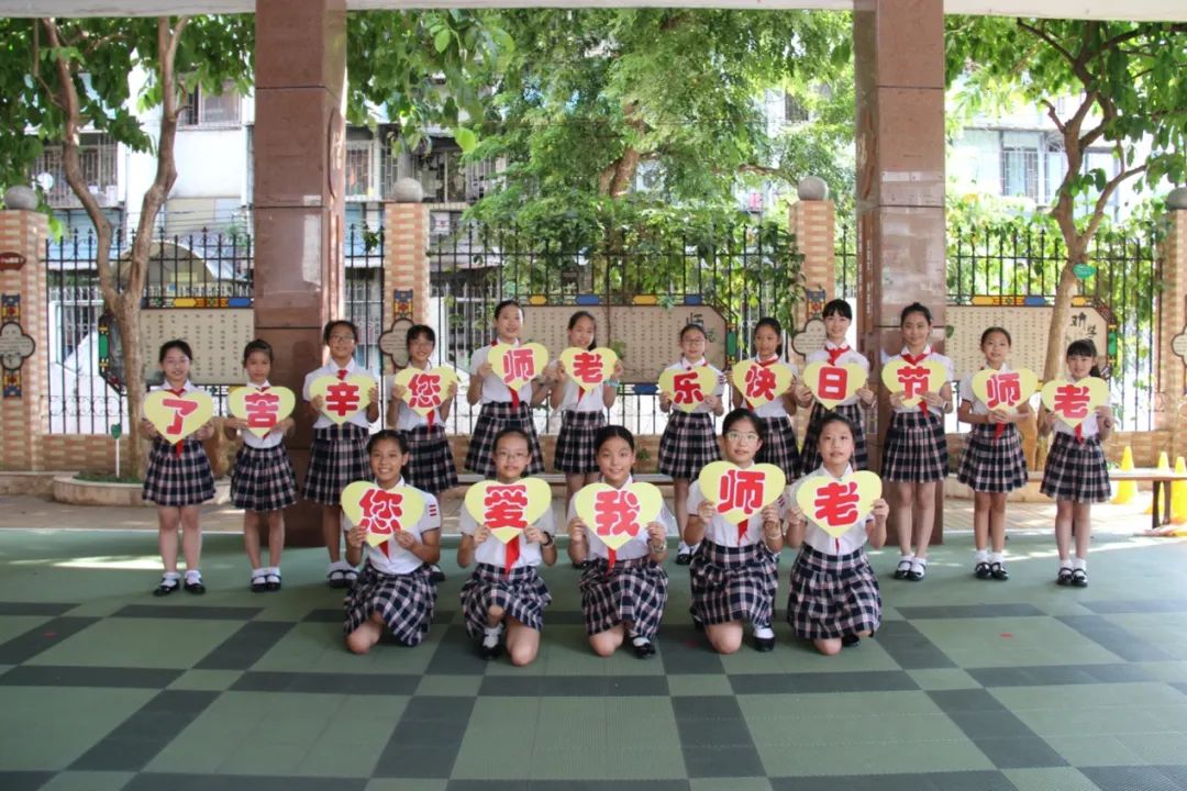当天,校园弥漫着喜庆、快乐的气氛。少先队员代表们笑容灿烂,在校门口迎接老师的到来;班里,学生为老师唱起感谢之歌《听我说谢谢你》,用手臂比出大大的爱心;学校大队部向全体同学发出倡议,写下对老师的美好祝福,粘贴到爱心墙上。