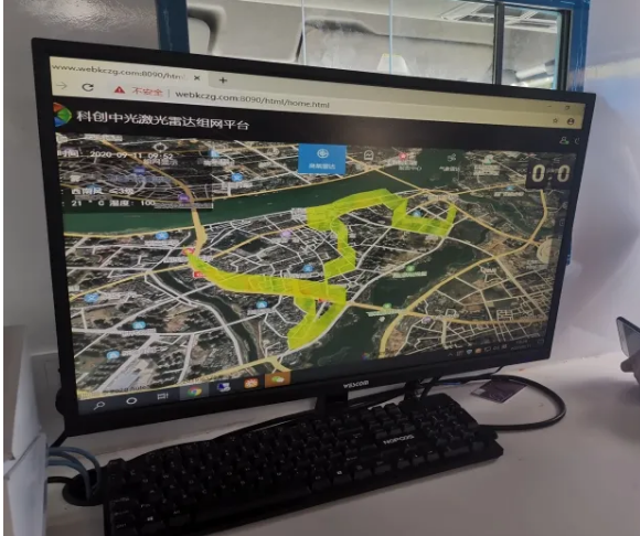 车上雷达发射出的激光对200余米高空大气进行扫描,扫描得出的数据传输到车上电脑里。电脑屏幕上显示出巡航车整个巡航路线,整个巡航路线以黄绿色线条为主,但是在桥北路与松岗路交界地带,出现了红色标志。
