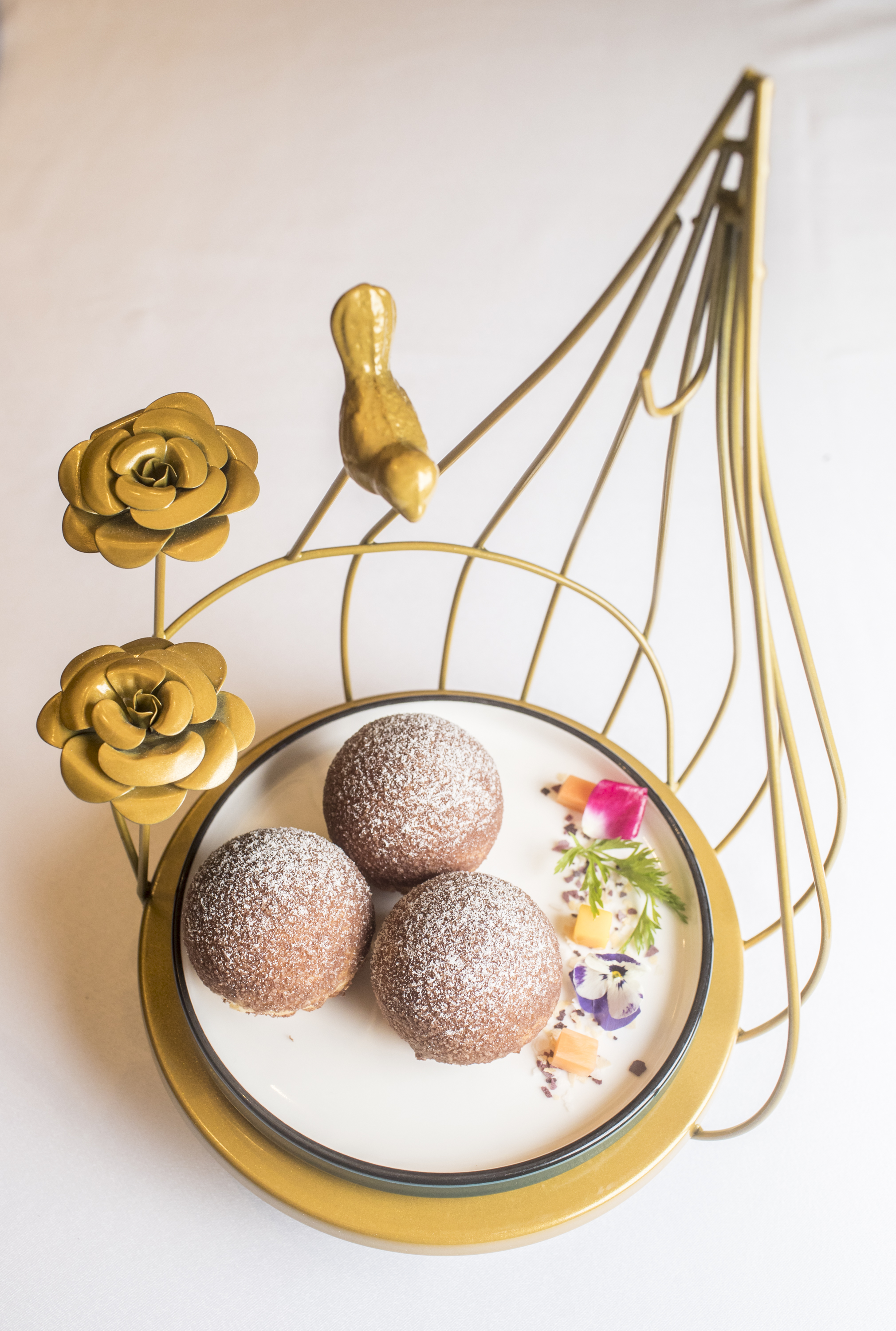 在常规的粉果里,有虾米、叉烧、菇粒和肉沫。但是这里的黑松露素粉果没有加肉,而是添加了爽脆的杏鲍菇、小瓜粒、提亮色泽的红萝卜粒以及红遍餐饮界的黑松露。新鲜和干货黑松露各持比例,将那独特的菌香散发在馅料的每一角落。粉果也不再是传统的鸡冠形了。改变形状的何止粉果,还有油条。它的名字叫“灯笼蛋香油条”。师傅有意把它炸出灯笼的形状来,添了几分喜庆。外脆内软,蛋与奶的味道混合得恰到好处。