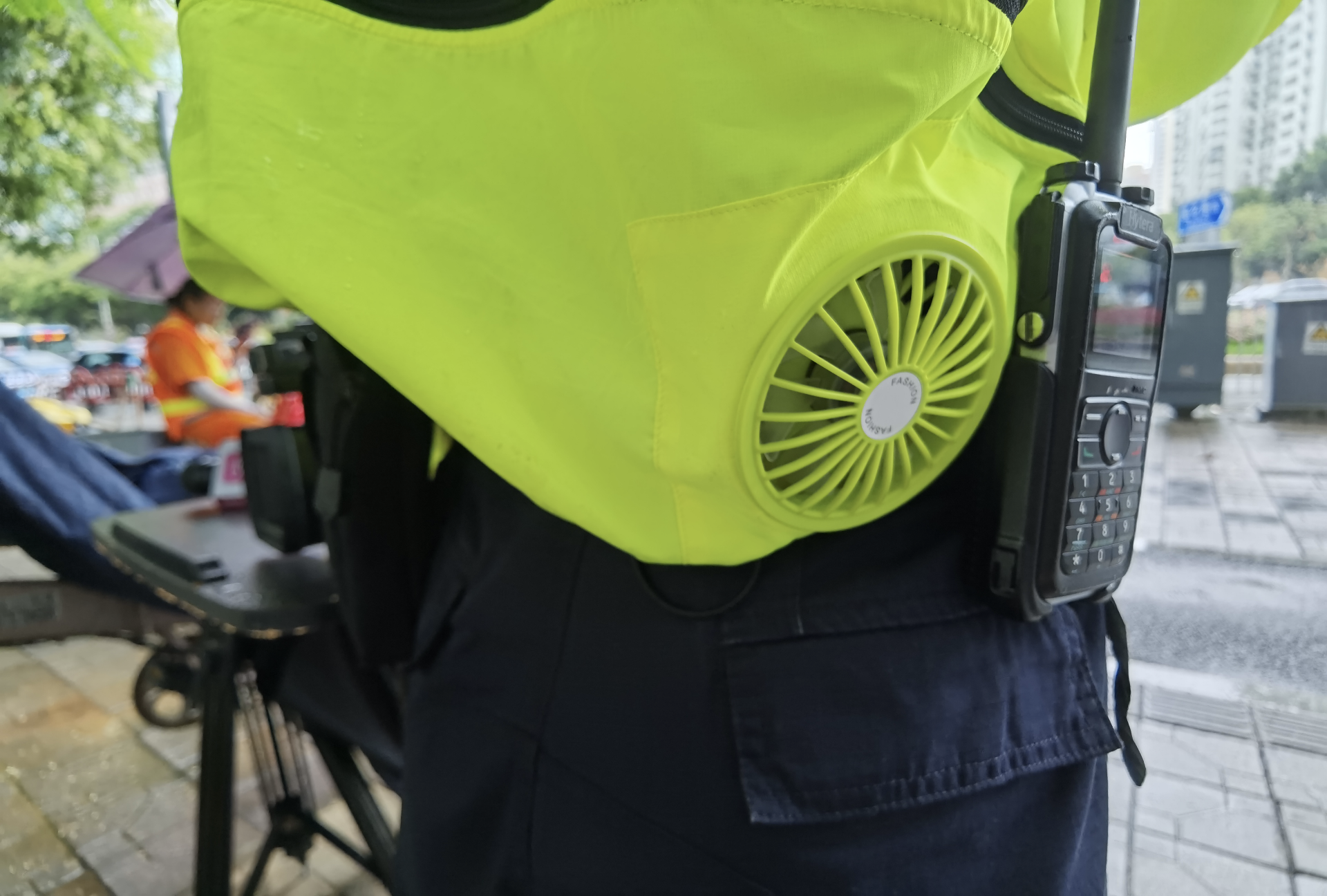 上午10时许,记者在新洲莲花路口见到福田交警大队机训中队队员许锡宏,他正穿着降温功能服执勤。“的确会凉快很多,有三档调解风速,热的时候就开一下。”他对记者说。记者注意到,衣服比较轻薄,后背底部装有两个风扇,为防止出汗皮肤粘连衣服和被风直吹,许锡宏在降温服内穿了一件打底衣。