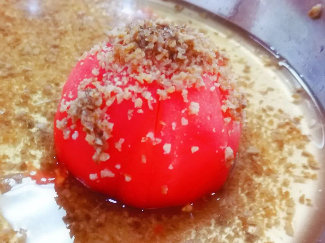 一个个大大的番茄,去皮后,切片,依然还保持着整个番茄的模样,红艳艳,好看得很!每个番茄上缀着细细碎碎的陈皮,陈皮的清香,一缕缕往鼻子涌,让我口水直流。