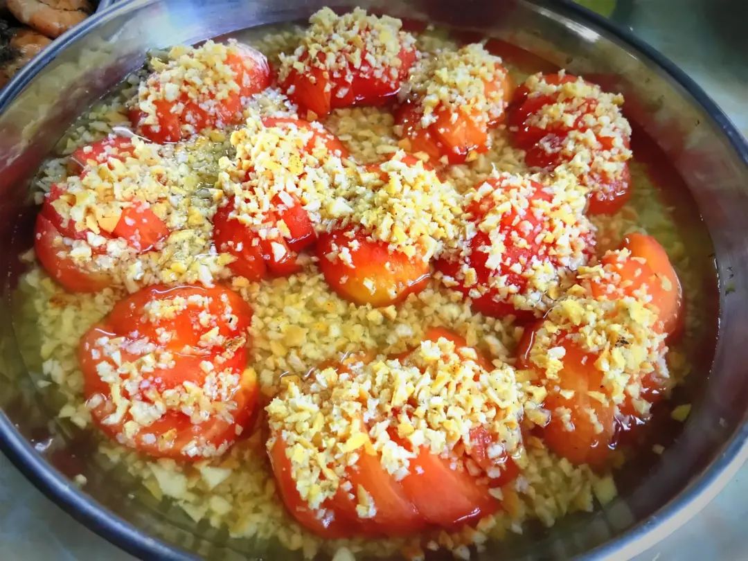 哇!又再次吃到陈皮蒸番茄啦!我赶紧夹上两三块,入口酸甜,回甘生津,清香四溢。再来上一碗饭,浇上陈皮番茄混合的汤汁,酸酸甜甜,满口余香,清爽解暑。
