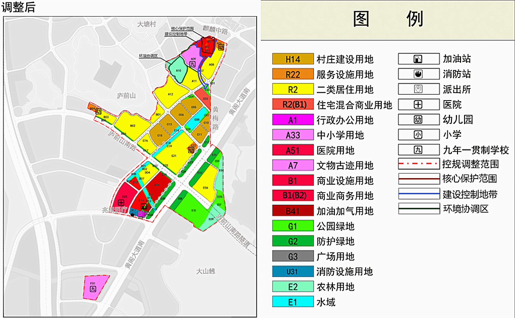 控规调整范围北至大塘村界,西至庐前山,东至大山,南至麒麟新城三期,包括旧村区域、新村区域和留用地区域,面积为115.87公顷。