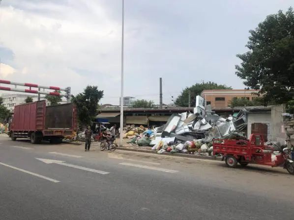 同德围南北高架东侧商铺位于铁路红线范围内,被3家公司用于废旧物资回收站,存在将回收物品随意堆放、违规占地经营等问题。废旧物资回收站及周边店铺占道乱堆放现象比较突出,三轮车、运输车辆随意停放,环境卫生比较差,屡劝不改,严重影响了西村地区市容市貌。