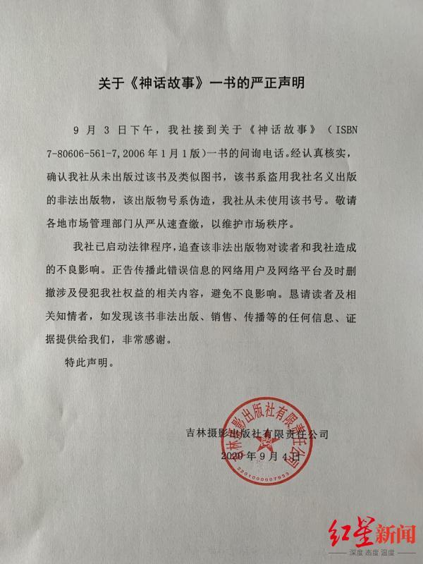 关于网友指出吉林摄影出版社发行的儿童教育读物《神话故事》中,收纳金某发表的涉黄文章一事,吉林摄影出版社处回复称:该书籍系他人盗用该出版社出版的非法出版物,出版号系伪造,该出版社从未出版过该书以及类似图书;该出版社已启动法律程序,追查该非法出版物对读者和出版社造成的不良影响;并希望各地市场管理部门从严从速查缴,以维护市场秩序。