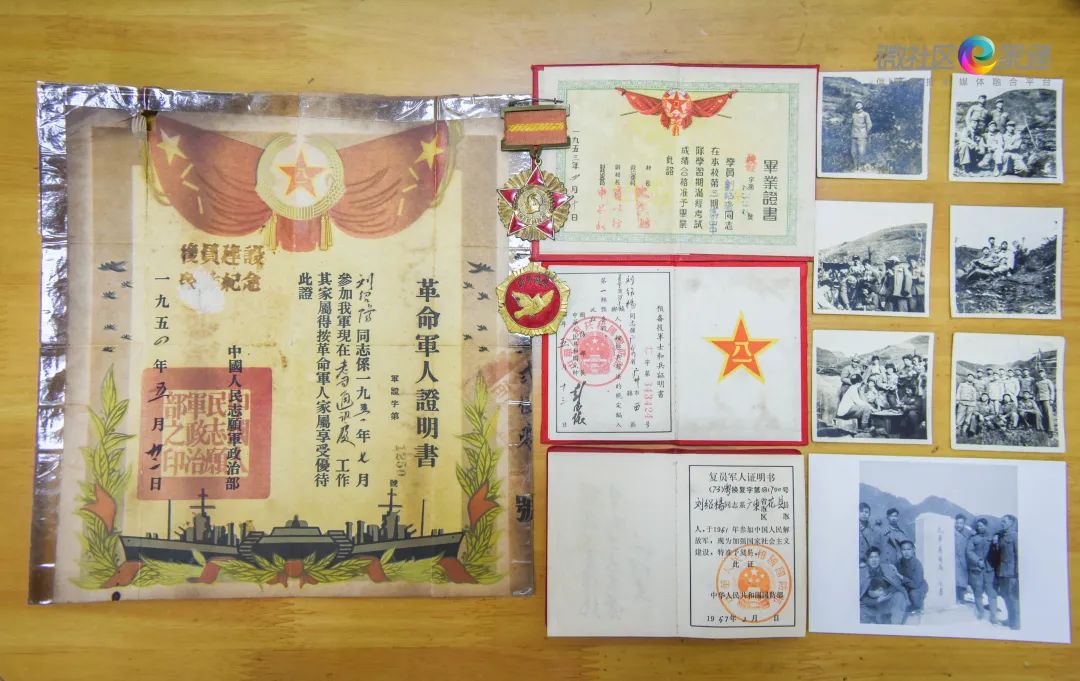 (刘绍扬军旅生涯的各种奖章、证书以及军装照)