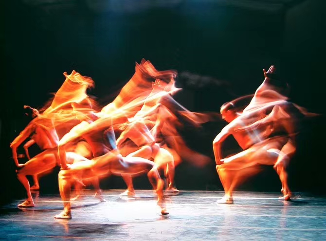 摄影展中有一幅作品:光化作红色的流沙,轻薄飘逸。舞台上一片黑幕,四位舞者舞动着光,舞动着流沙,成为镜头世界里孤独的主角,此刻瞬间的动感化作永恒。张勇表示,这是他的作品。镜头里,褪去了“障碍”的标签。