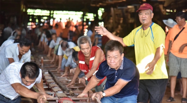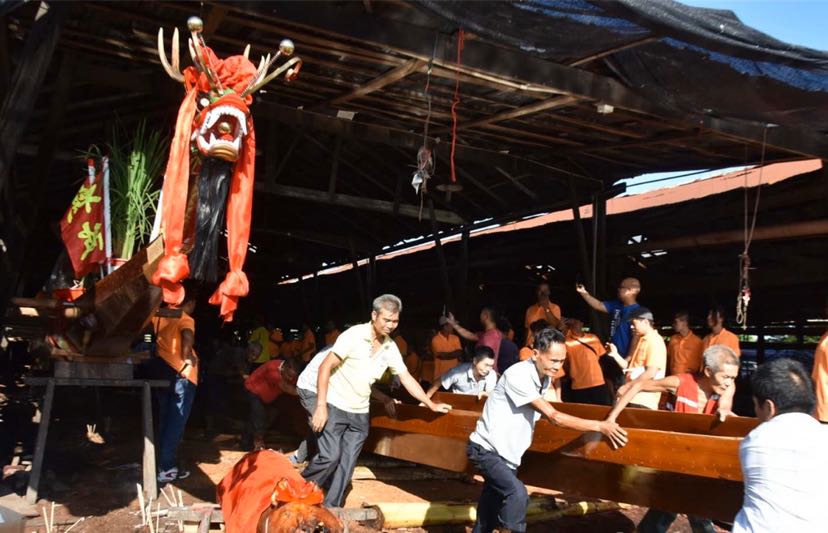 随着阵阵锣鼓声响起,来接龙舟的汉子们站在“新龙”两侧,听着号令一齐卯足劲儿,抬着龙舟一步步将它往前推送入船厂前的河中。整个竣水仪式遵循传统习俗进行,每一个环节都是庄重、严肃的,饱含着村民祈求平安、顺利、好运的愿望。
