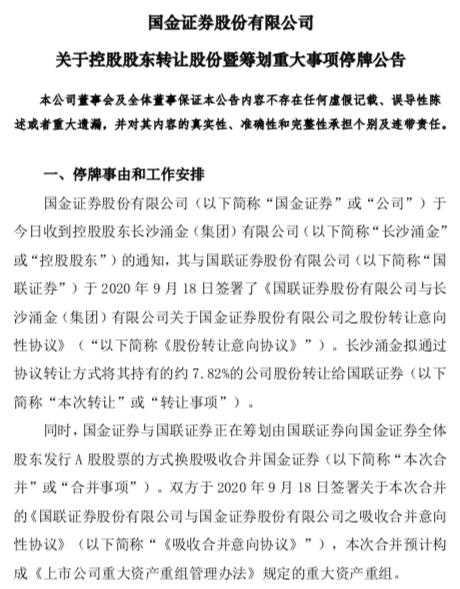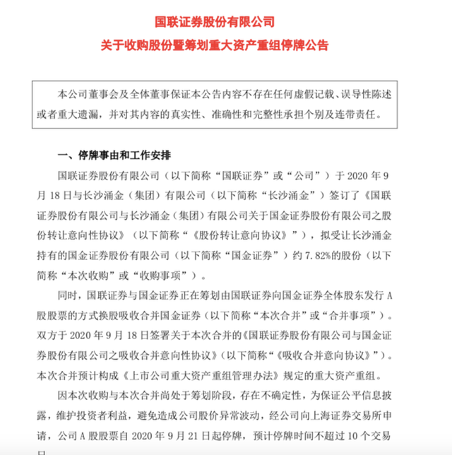 国联证券、国金证券均表示,因本次转让与本次合并尚处于筹划阶段,存在不确定性,为保证公平信息披露,维护投资者利益,避免造成公司股价异常波动,经公司向上海证券交易所申请,两家券商股票自2020年9月21日起停牌,预计停牌时间不超过10个交易日。
