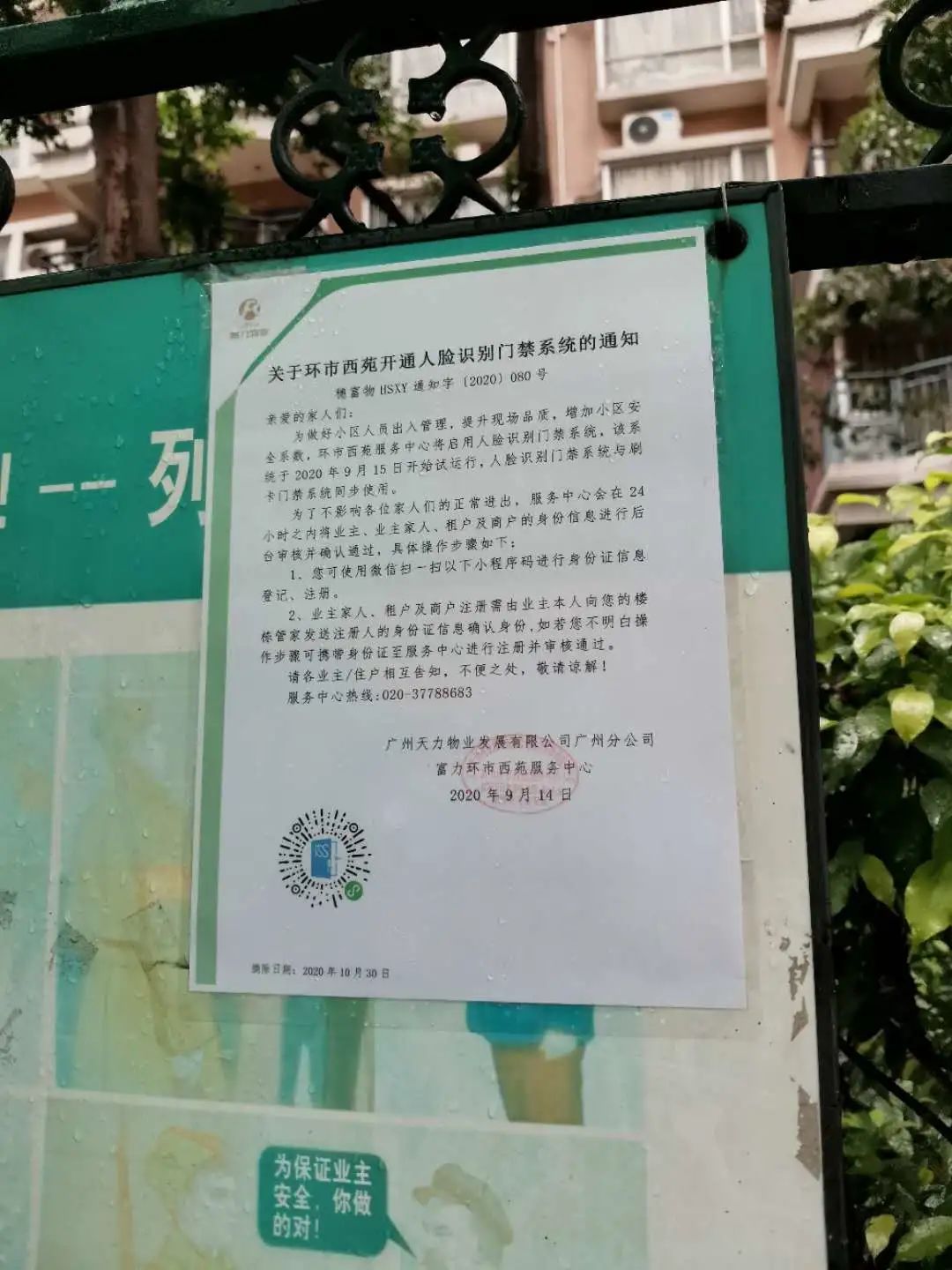 在小区入口处,环市西苑社区物业公司在入口处已贴示有关于开通人脸识别门禁系统的通知。为方便小区业主录入信息,通知上印制有小程序码,业主及住户只要按步骤通过小程序码进行身份信息的登记和注册,经后台审核并确认通过后,就可以“刷脸”进入小区。