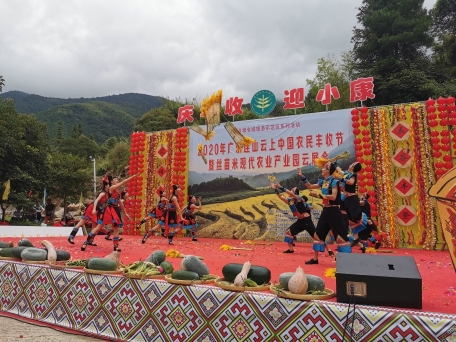身着壮、瑶民族服装的舞者为游客和村民们献上《幸福中国一起走》《稻香时节》《我在连山遇见你》《瑶鼓花花》《丰收之夜》《四季对唱》《说丰年》《绿色连山走起来》等精彩节目,台下喝彩声、掌声不断。