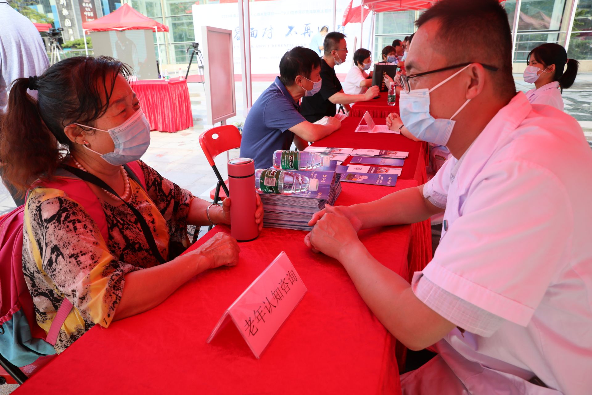 活动现场,针对阿尔茨海默病的相关宣教视频全程循环播放,发放相关宣传折页1000余份。现场志愿者和医生们结合“名字串串烧”、“数字大考验”等互动游戏形式,对老人的心理健康状况和认知功能进行初步摸查,对现场群众提出的问题进行针对性答疑和耐心讲解,为每一位老人进行血压、血糖测量、开展“老年痴呆量表”测评,指导大家认识老年痴呆的病因、起病及发展过程,并为老年痴呆患者及家属提供一对一的诊断、护理、用药指导。使参与活动的老人认识到预防痴呆疾病的重要性。