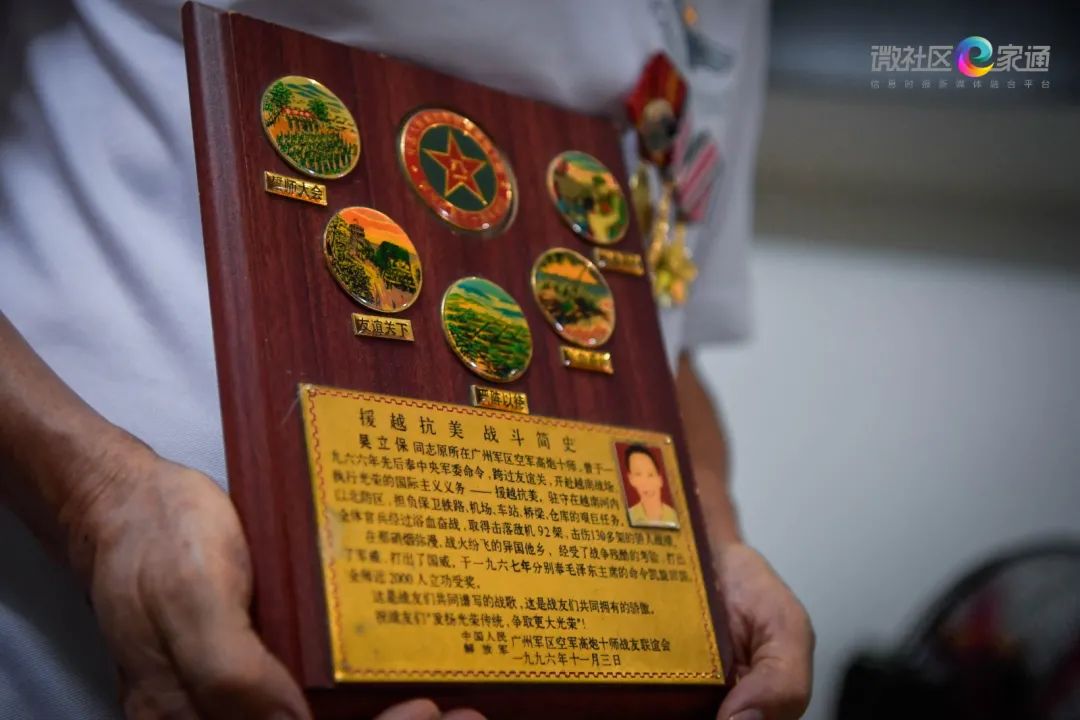 中国人民解放军(前)广州军区空军高炮十师战友联谊会为吴立保颁发的,写有他在援越抗美战斗简史的纪念牌匾。