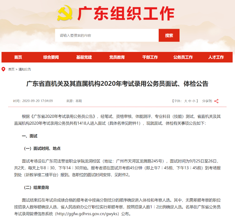 今年,共有1418人进入省直机关及其直属机构2020年考试录用公务员面试。面试考场设在广东司法警官职业学院龙洞校区,面试时间为9月25日至26日,共2天,每天上午8︰30、下午14︰30开始。详情>>>