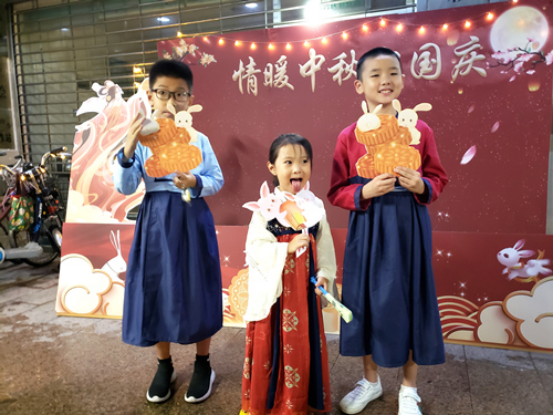本次活动设置了灯谜区、汉服体验区、月下茶艺区等多个特色摊位供居民参加,其中最有特色的莫过于汉服巡游SHOW,社工站提前准备了各式汉服供居民免费领取,让大家共同感受传统文化的魅力。活动正式开始后,驷马涌四周的灯光亮起,涌边配合中国古典音乐,营造了温馨浪漫的中秋氛围。在志愿者的带领下,居民朋友穿着汉服,巡走在涌边,玩起了猜灯谜、投壶的游戏,仿佛回到古时候一样。路过居民纷纷拍照,并与巡游队伍合影,学生小婕表示:以前在大街上看见过哥哥姐姐穿汉服觉得很好看,一直没勇气穿,今天自己终于能大胆穿上汉服啦。