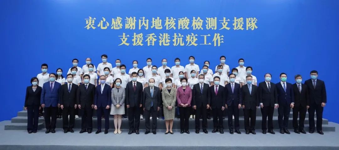 ▲9月15日,香港特區政府為支援隊舉辦歡送儀式,香港特區行政長官林鄭月娥說:「要在短時間內完成接近180萬個檢測是一件艱巨而光榮的任務,是火眼實驗室內每一位工作人員辛勞工作的成果,是承載著中央和內地人民對香港同胞的關懷和支援,各位內地核酸檢測隊隊員,您們做到了,您們辛苦了,謝謝。」