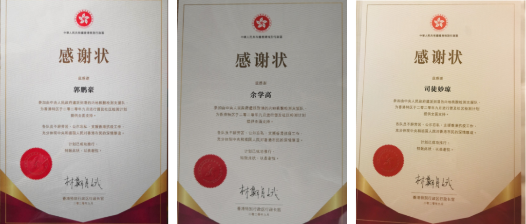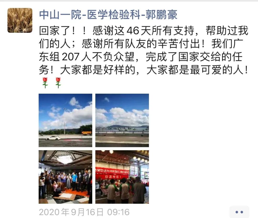 9月16日,內地核酸檢測支援隊隊員,中山一院醫學檢驗科郭鵬豪主管技師、余學高主管技師和司徒妙瓊副主任護理師分別在香港奮戰46天和42天後返回內地。
