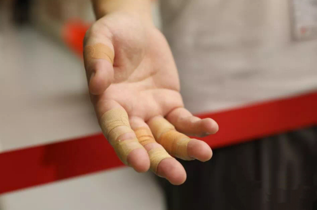 ▲隊員的手傷痕累累,每個關節都貼了膠布。支援隊裏最受歡迎的是肌肉止痛膏、眼藥水、膠布等,短短14天廣東隊已發出500多盒膏藥。