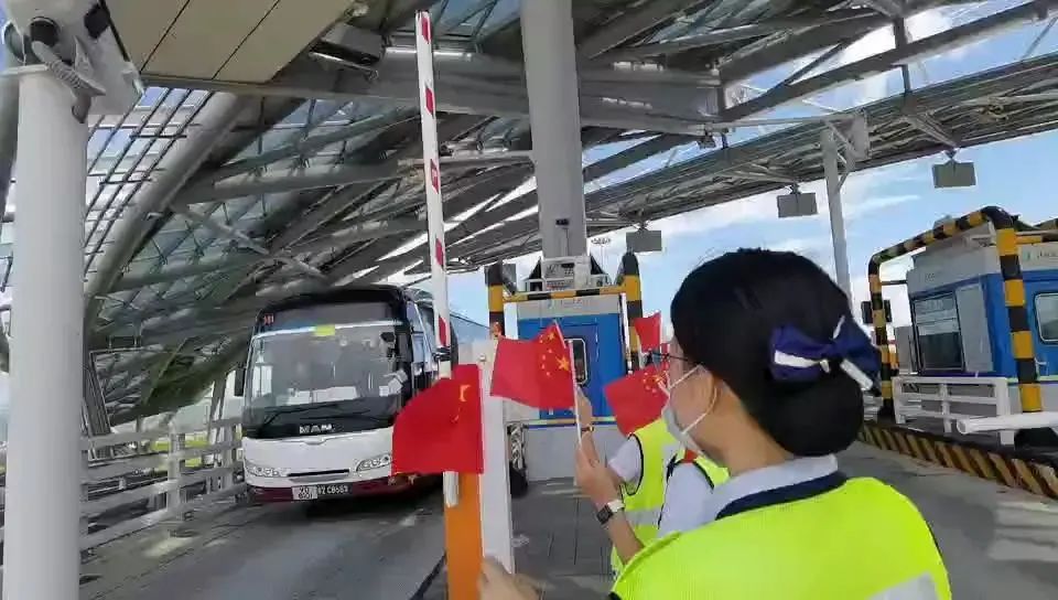 ▲9月16日中午時分,載著內地援港核酸檢測隊廣東組的10輛香港大巴在交警車輛護送下經港珠澳大橋返回內地