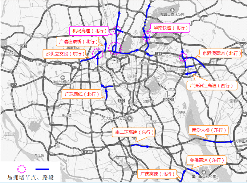 出城方面,预计节前一日(9月30日)13-24时、假期首日(10月1日)的0-2时及9-16时,迎来出城车流高峰时段,期间机场高速(三元里-蚌湖立交段)、华南快速路(春岗立交-石门堂隧道)、莞佛高速(虎门大桥段)、乐广高速(花山互通立交-花山隧道段)、南二环高速、南沙大桥等瓶颈路段车流密集,将出现经常性长时间拥堵缓行。