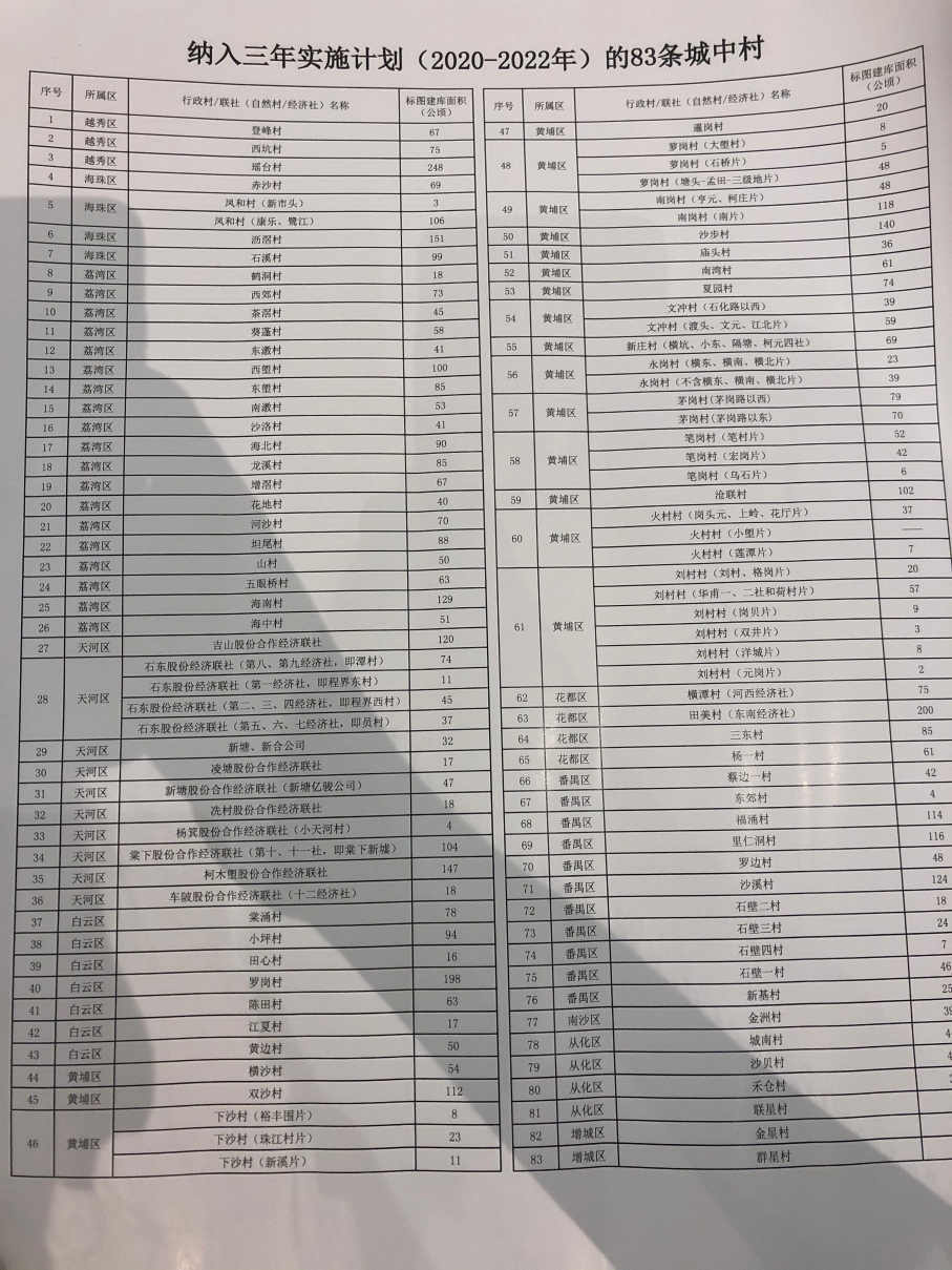 全市共有城中村1104个,未来3年实施改造的83条城中村中,荔湾区19条,数量居全市第一;黄埔区18条,位列第二。此外,番禺区11条,天河区10条,海珠区4条,越秀区3条,白云区7条,花都区4条,南沙区1条,从化区4条,增城区2条。