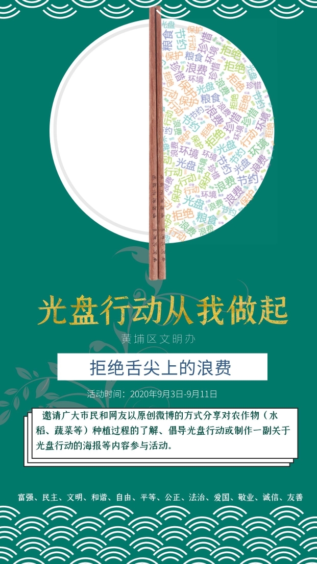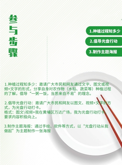 为倡导绿色环保、厉行节约的就餐新风尚,在广州市文明办指导下,@文明黄埔近日开展以“光盘行动从我做起”为主题的网络文明传播活动,营造文明用餐、和谐消费的社会氛围。