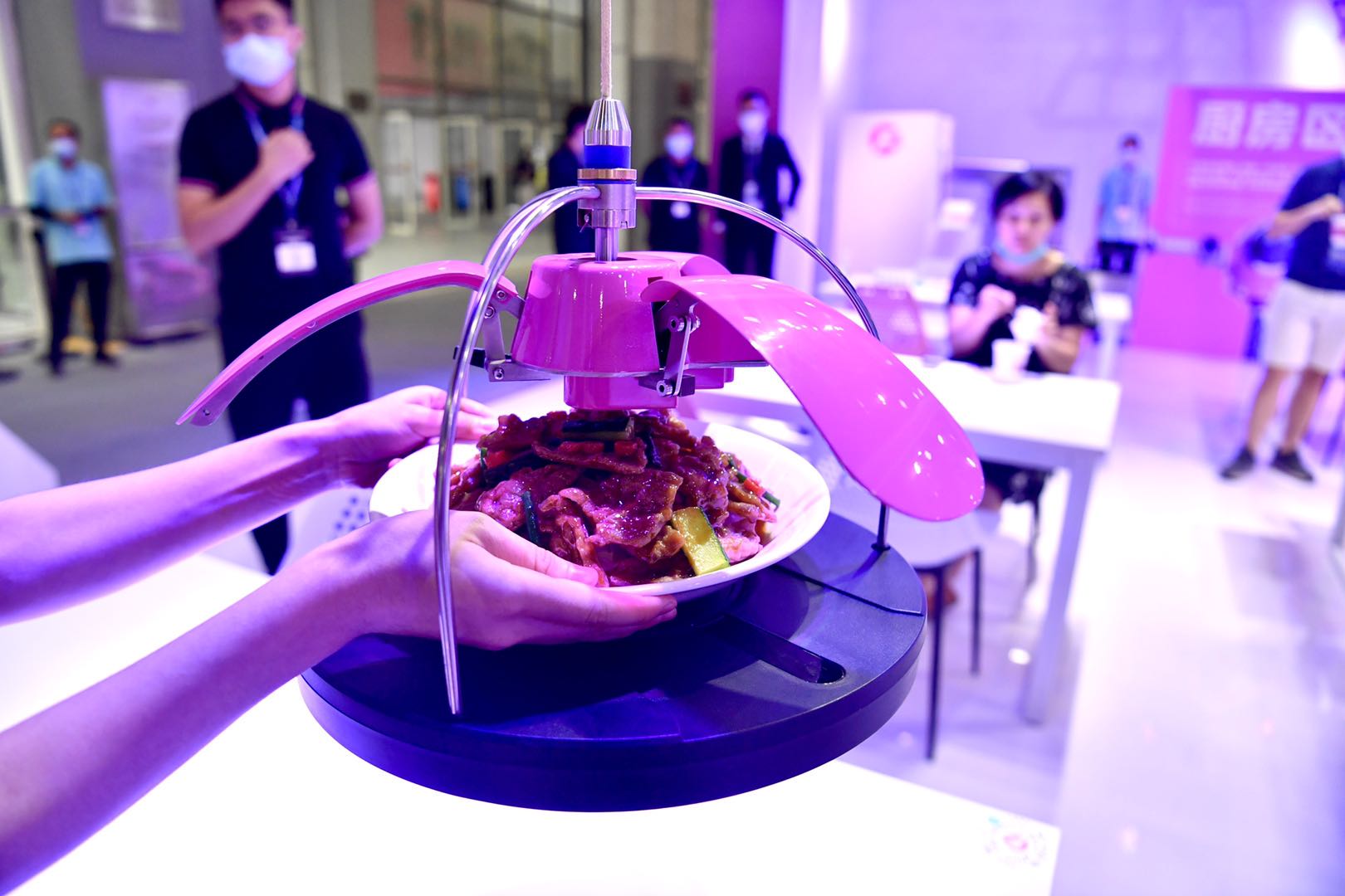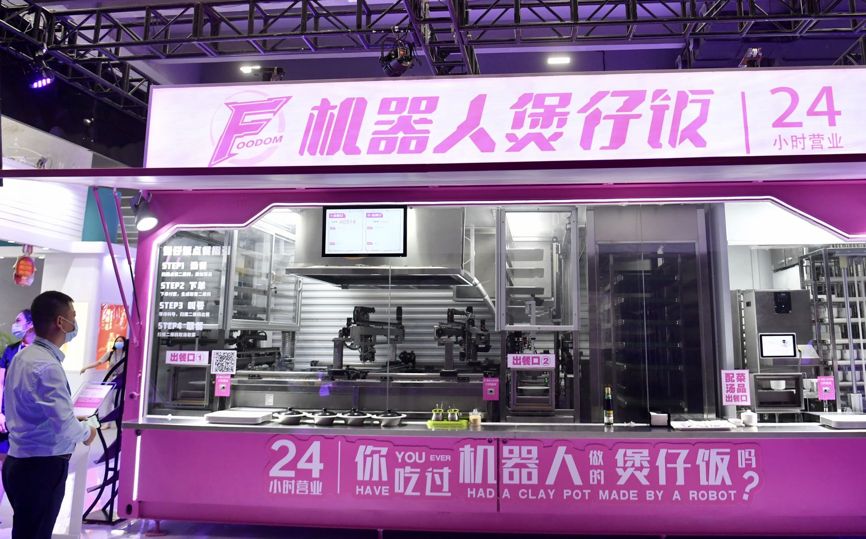 餐饮机器人煎炸、顺德煲仔饭、调制咖啡、制作冰淇淋、菜品从“天”而降……国际品牌展区现场香气扑鼻,寻味而至的碧桂园千玺机器人展台,这些美食都是出自一个个机器人“大厨”之手。