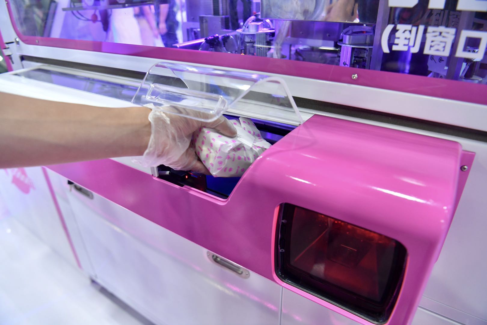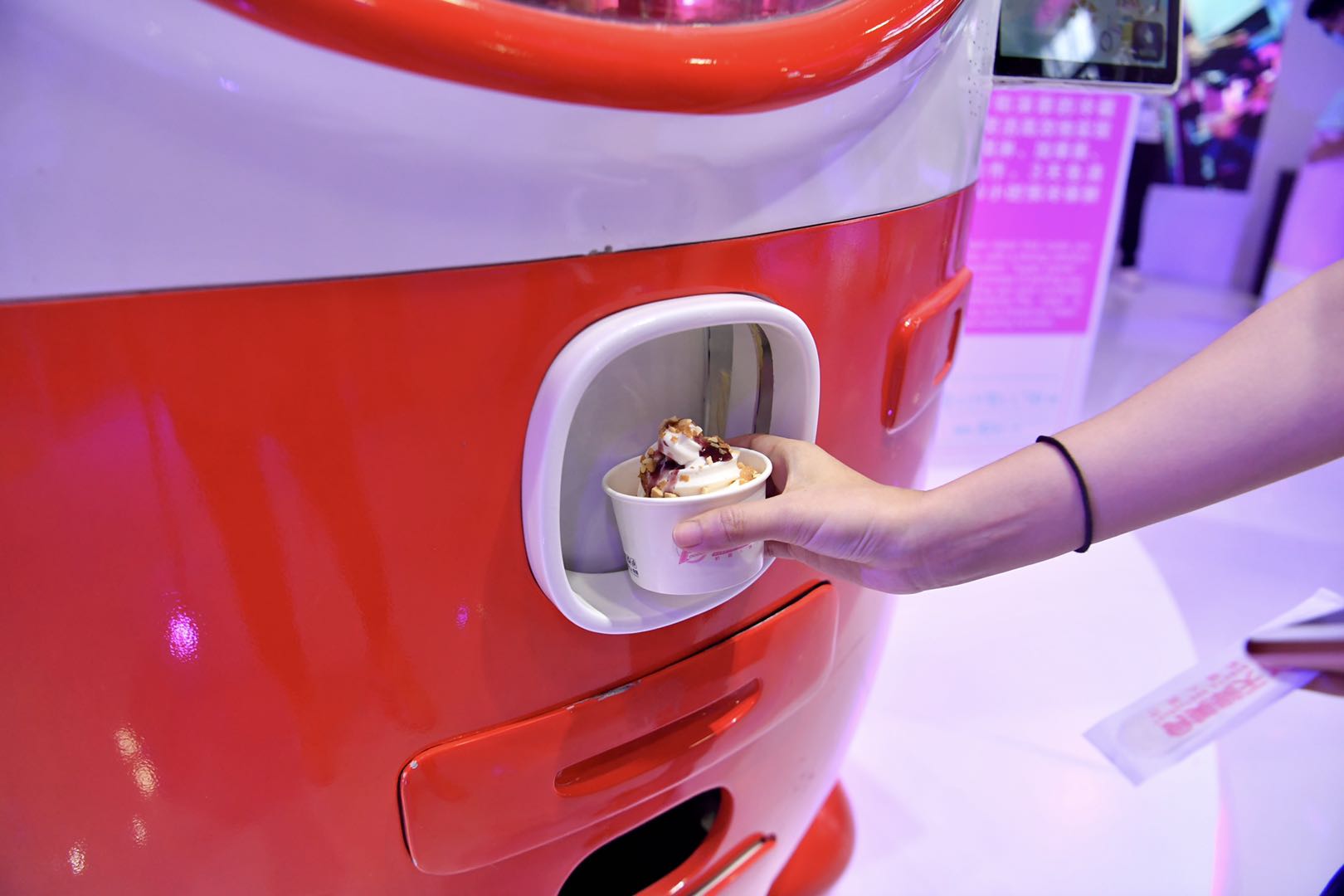 在新款冰淇淋机器人前,可以通过大屏幕选择蓝莓酱、草莓酱、花生碎自主DIY雪糕;现场还有造型萌态、会主动避让的送餐机器人忙碌穿梭于人群之中。
