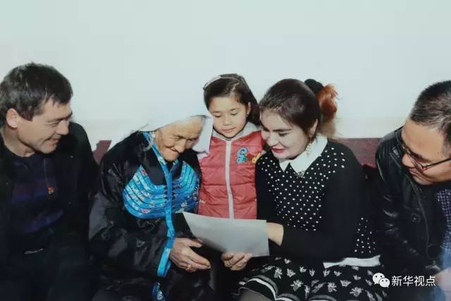 2017年3月,十二届全国人大五次会议新疆代表团审议现场,一位代表拿出库尔班大叔家人的照片给习近平看。