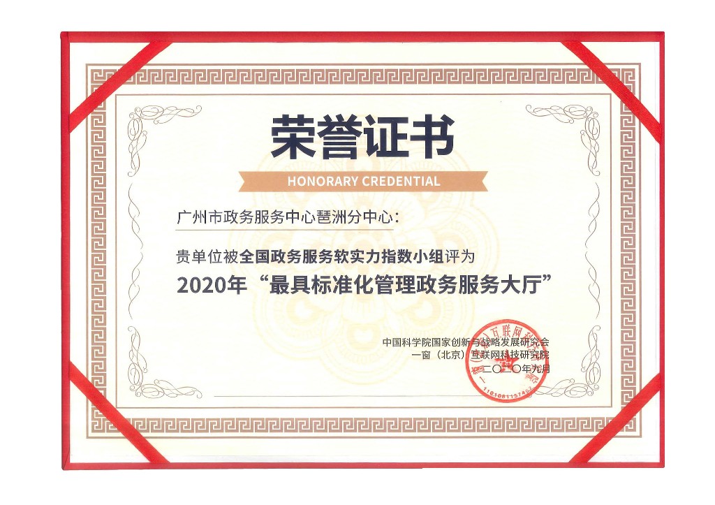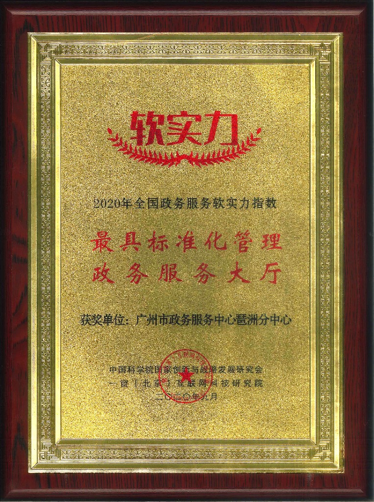 经全国政务服务软实力指数小组对全国300个政务中心开展的层层评估筛选及评审,深入挖掘全国政务服务改革优秀案例,广州市政务服务中心琶洲分中心(以下简称“琶洲分中心”)被组委会专家组授予“全国最具标准化管理政务服务大厅”荣誉称号。据悉,琶洲分中心是全省唯一一家进驻功能片区政务服务中心,也是全市唯一一家政务服务中心获得全国最具标准化管理政务服务大厅殊荣。