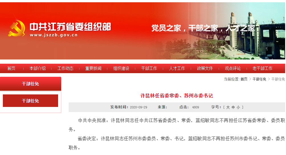 省委决定:许昆林同志任苏州市委委员、常委、书记,蓝绍敏同志不再担任苏州市委书记、常委、委员职务。