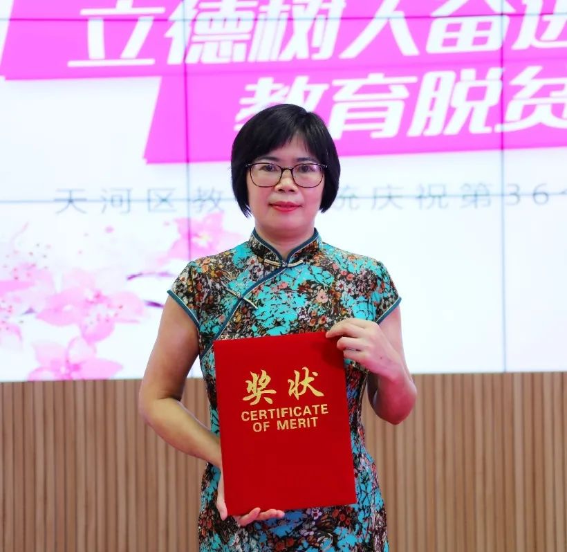 在教育教学中她严格要求自己,不断提升学科素养,成绩显著。2014年、2015年均获得“广州市高考(理科)英语突出贡献奖”,“广州市高考(文科)英语突出贡献奖”,2015年被评为“天河区教育风云人物”,2018年被评为广东省优秀民办教师,学校先进工作者,2019年被天河区教育局评为先进工作者。2020年被天河区教育局评为“感动天河的最美教师”。