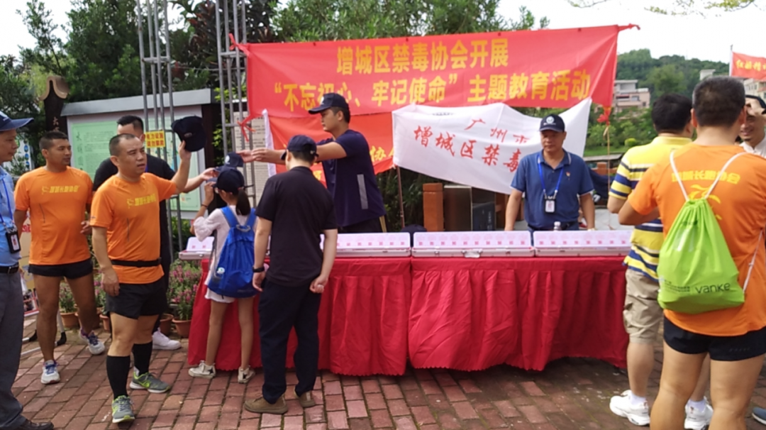 活动正式开始前,增城区禁毒协会、增江街禁毒办设置摊位,通过派发宣传单张以及仿真毒品展览等形式,向当天参与活动的跑者们以及来大埔围村游玩的游客宣传禁毒知识。