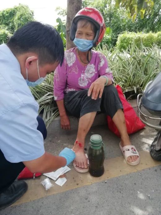 网格员为骑车受伤的居民进行简单的消毒处理。