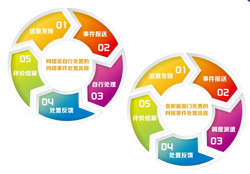 网格员的工作模式是有一个有效的闭环,网格员负责采集数据以及事件上报,能自行解决的事件由网格员自行解决,不能解决的事件则通过智慧平台流转至区或者由镇网格中心负责将事件分拨给区或镇相对应的职能部门处理,处置部门将结果反馈给网格员。