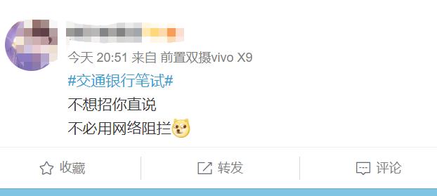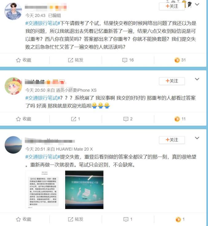 27日,继中国银行因校招笔试题目难度登上热搜后,交通银行也“中枪”。不少参加笔试的考生在微博发文称,在考试过程中,因系统出现崩溃,出现无法提交试卷的情况。有考生称,“提交失败退出系统后,再进去答案全没了,硬凭记忆重新填了一遍。”